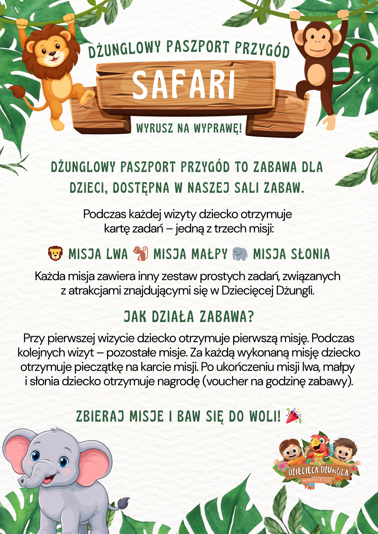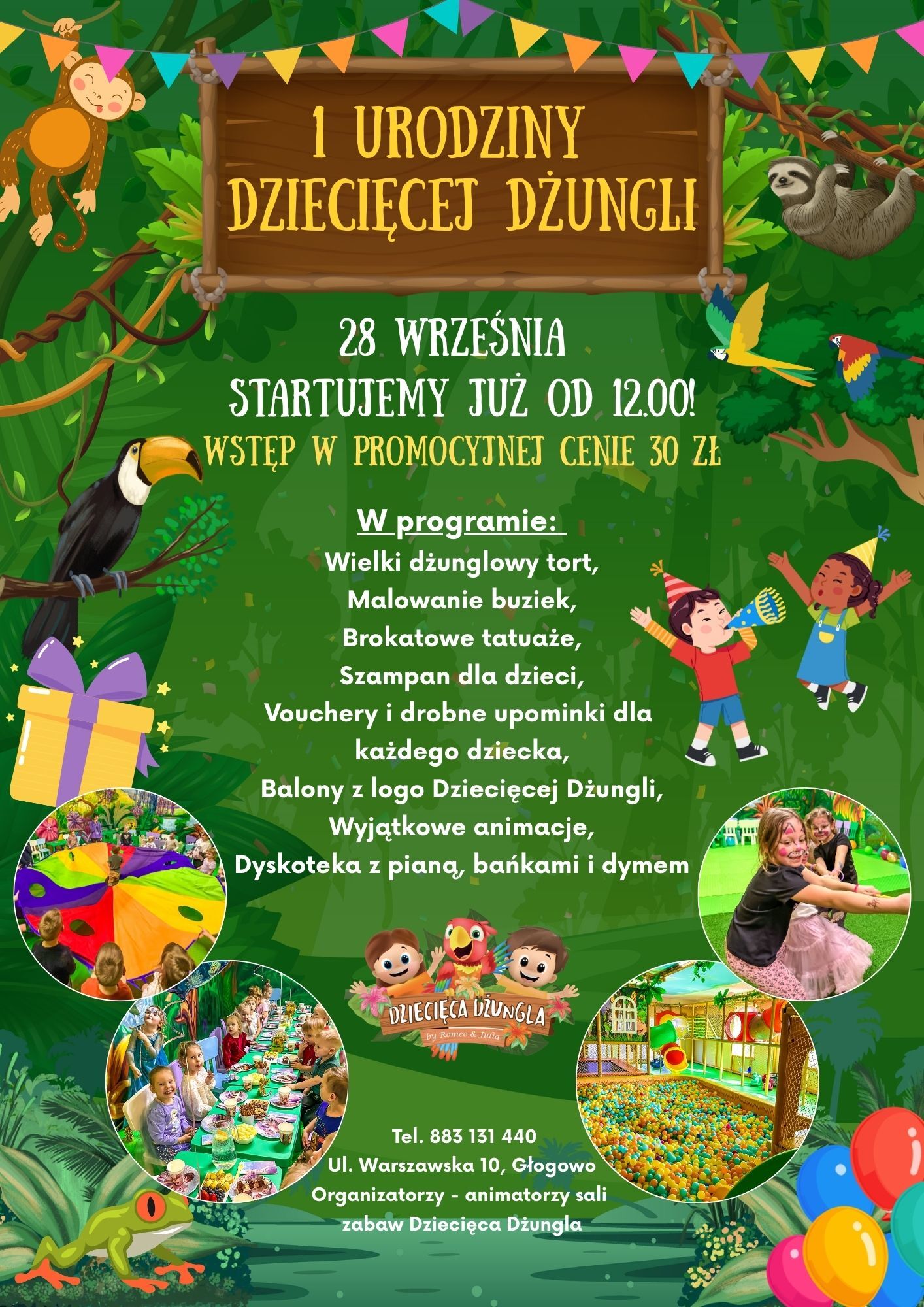 Dziecięca Dżungla obchodzi swoje pierwsze urodziny! Już 28 września od godziny 12:00 zapraszamy wszystkie dzieci i rodziców na wyjątkową, pełną atrakcji imprezę. Czeka na Was magiczna atmosfera, mnóstwo zabawy i niespodzianki przygotowane specjalnie z myślą o najmłodszych. To doskonała okazja, aby spędzić wspólnie czas, świętować i stworzyć niezapomniane wspomnienia!