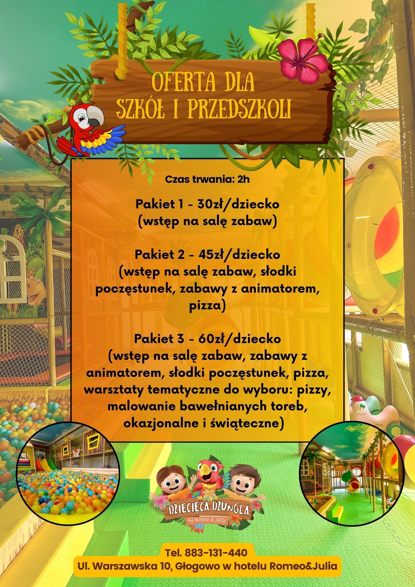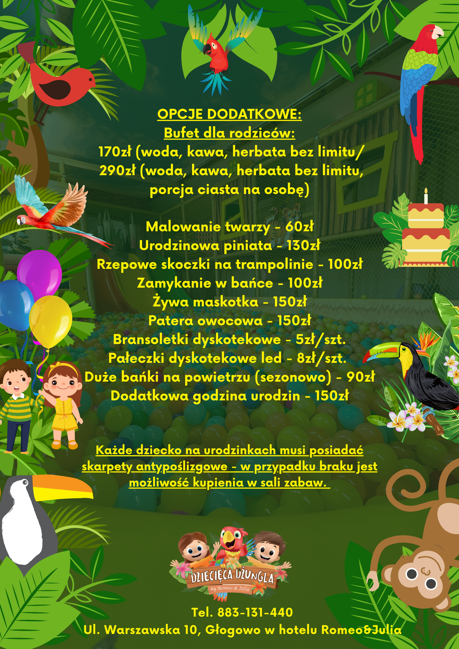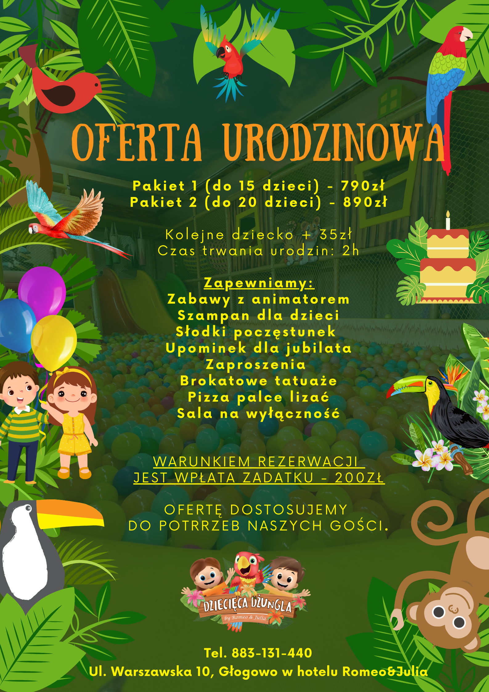 Zbliżają się urodziny Twojego dziecka? Zorganizuj je w Dziecięcej Dżungli - miejscu, gdzie maluchy mogą przeżyć ekscytującą przygodę! Nasza sala zabaw to idealne miejsce na spędzenie wyjątkowego dnia pełnego radości, śmiechu i niezapomnianych chwil! Dzięki bogatej ofercie atrakcji, Twoje dziecko oraz jego goście poczują się jak prawdziwi odkrywcy w magicznej Dżungli!