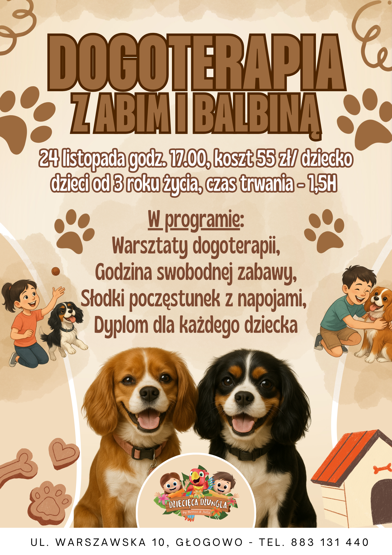 Już 24 listopada o godz. 17:00 w naszej sali zabaw odbędą się radosne warsztaty, podczas których dzieci poznają cudowny świat przyjaźni z psami. To pełne ciepła i uśmiechu spotkanie, które rozwija empatię, uczy delikatności i daje mnóstwo radości!
