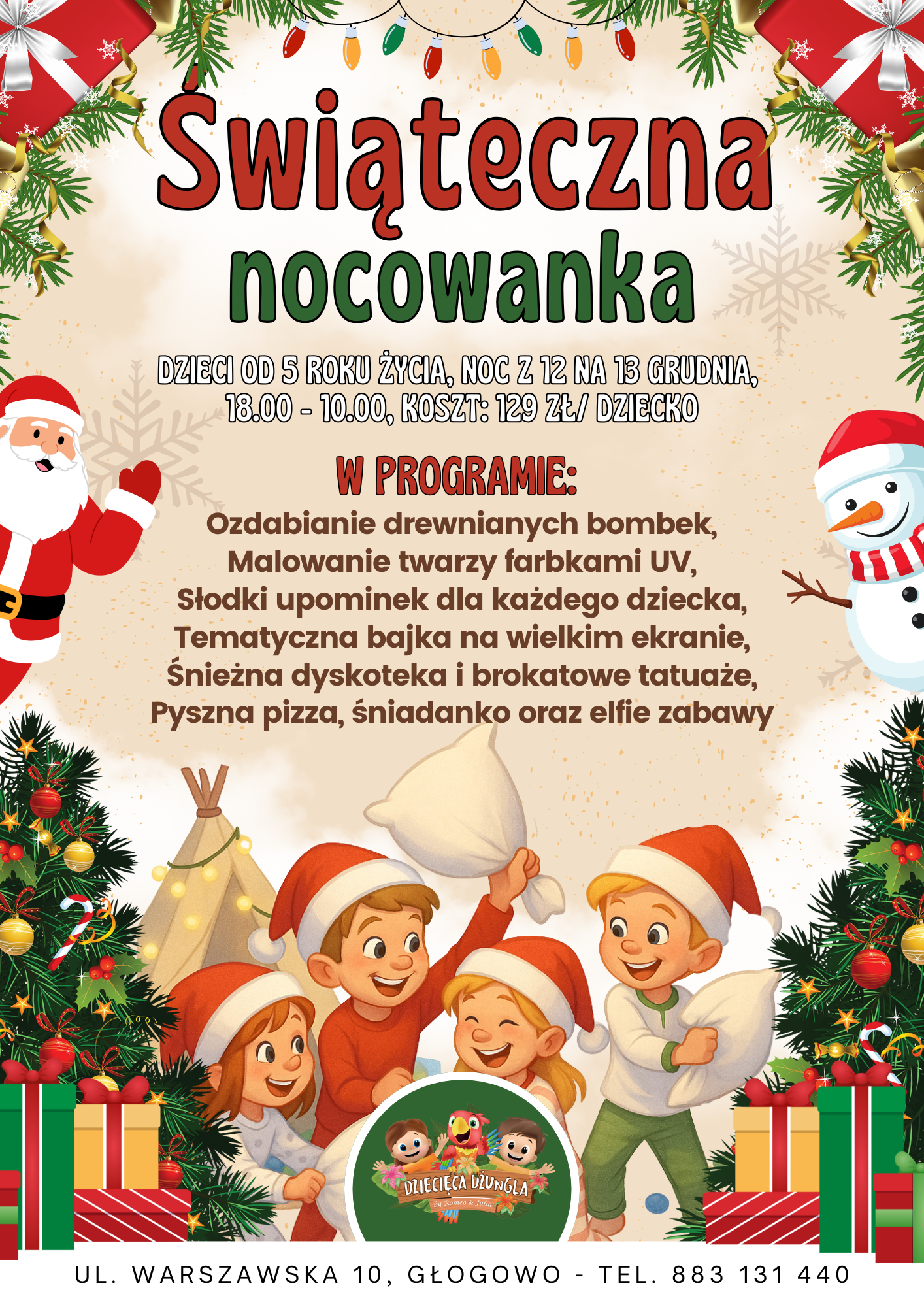 Świąteczna nocowanka to wyjątkowe wydarzenie pełne magii, radości i zabawy dla najmłodszych. Dzieci spędzą niezapomnianą noc pełną kreatywnych atrakcji, świątecznych niespodzianek i elfich zabaw. To idealna okazja, by poczuć prawdziwego ducha Świąt w ciepłej, bajkowej atmosferze.