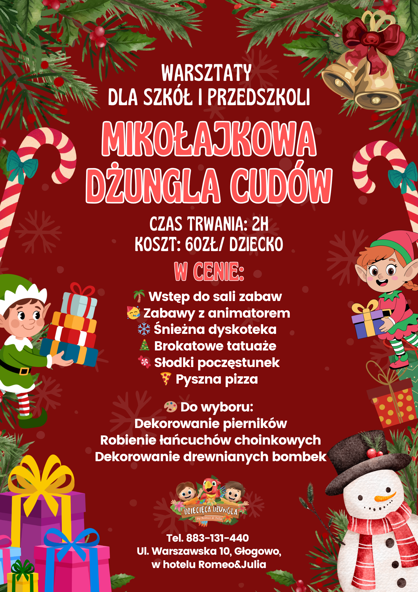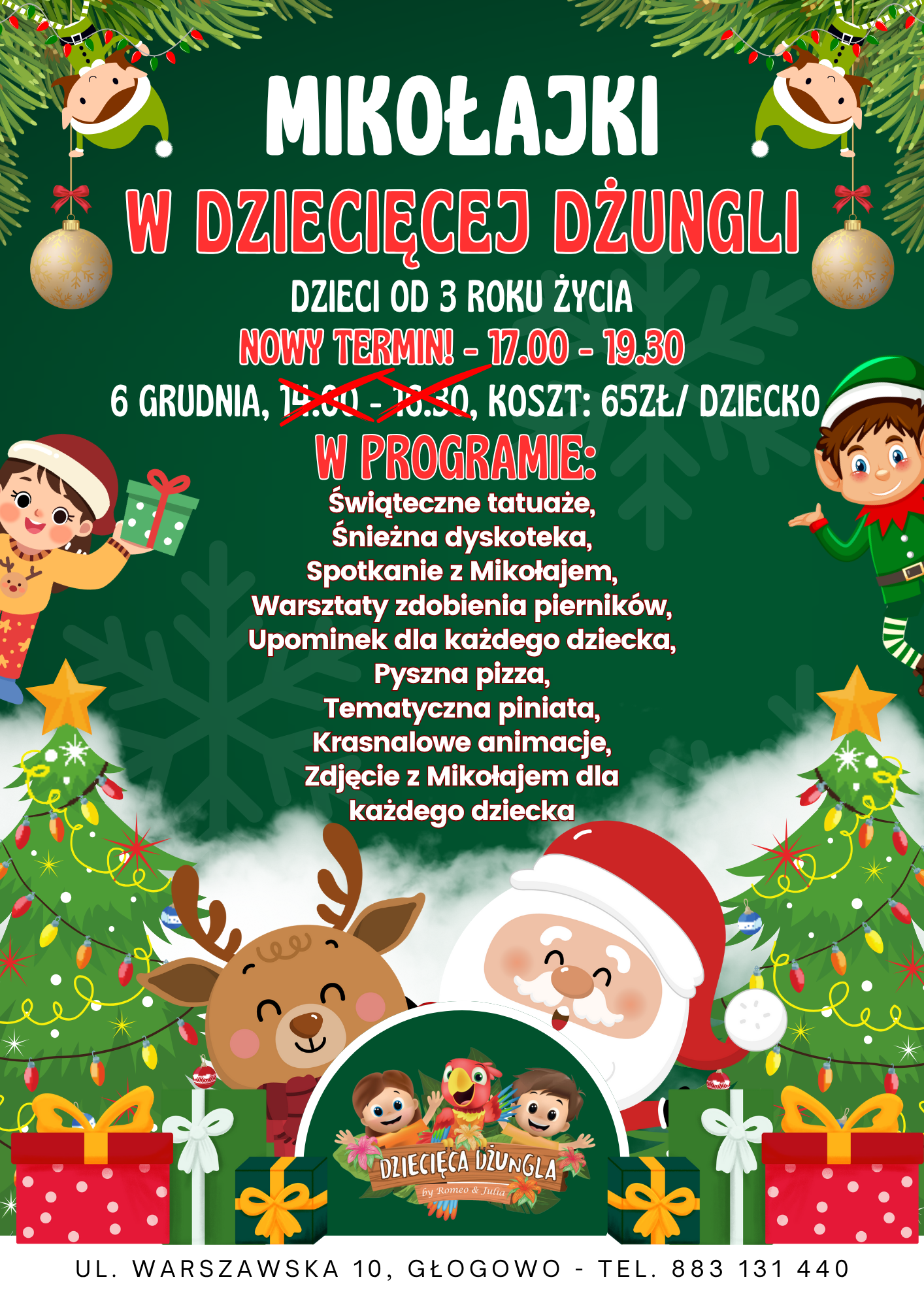 Zapraszamy wszystkie dzieci na wyjątkowe Mikołajki w Dziecięcej Dżungli, pełne radości, zabawy i świątecznej magii! W programie czeka mnóstwo atrakcji, kreatywnych warsztatów i wesołych animacji. Każde dziecko otrzyma również świąteczny upominek oraz pamiątkowe zdjęcie z Mikołajem!