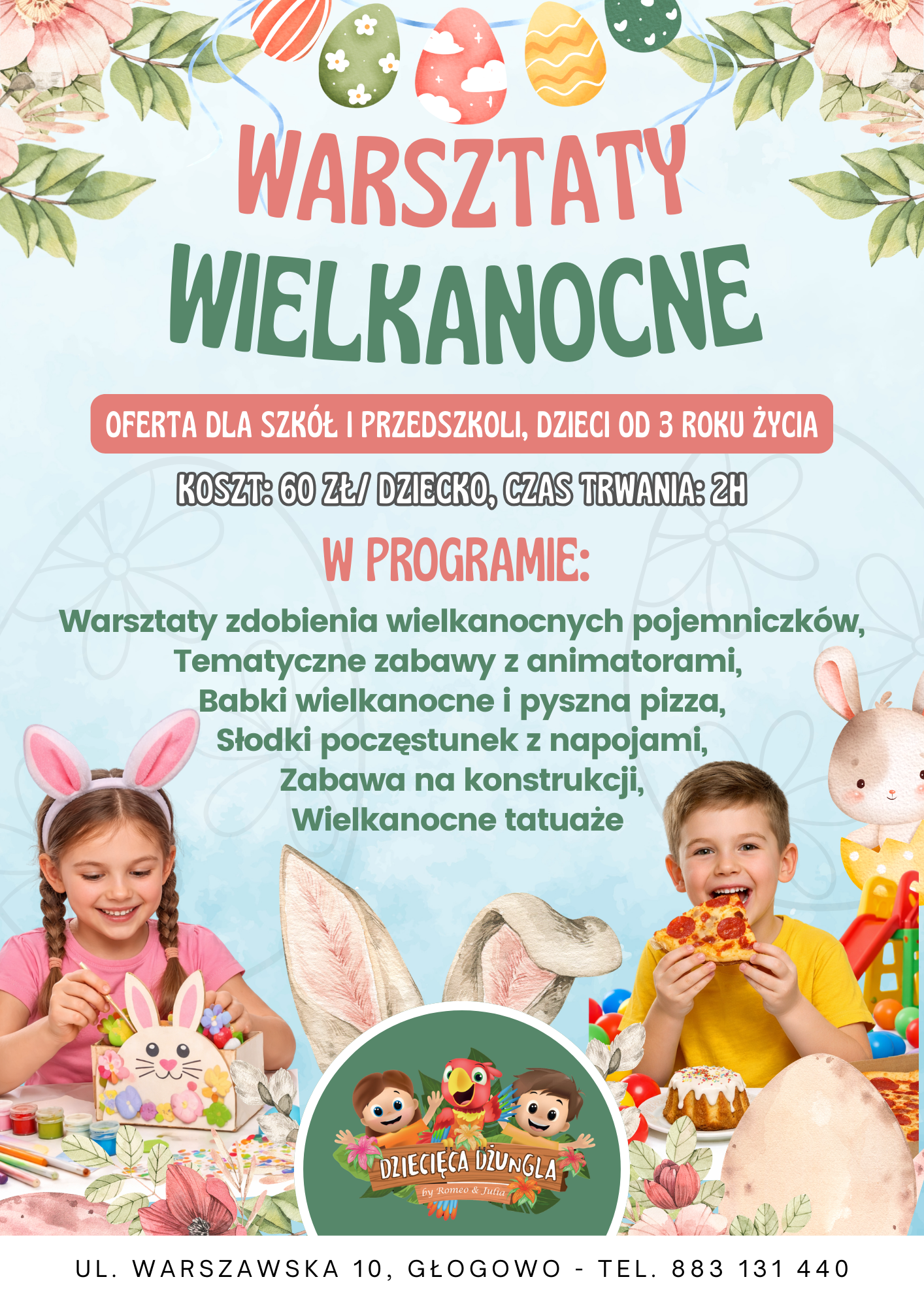 Zapraszamy szkoły i przedszkola na radosne Warsztaty Wielkanocne pełne kreatywnej zabawy i świątecznej atmosfery. To dwugodzinne spotkanie stworzone z myślą o dzieciach od 3 roku życia, podczas którego nie zabraknie animacji, warsztatów i pysznego poczęstunku. Gwarantujemy uśmiech, integrację i mnóstwo wielkanocnych wrażeń.