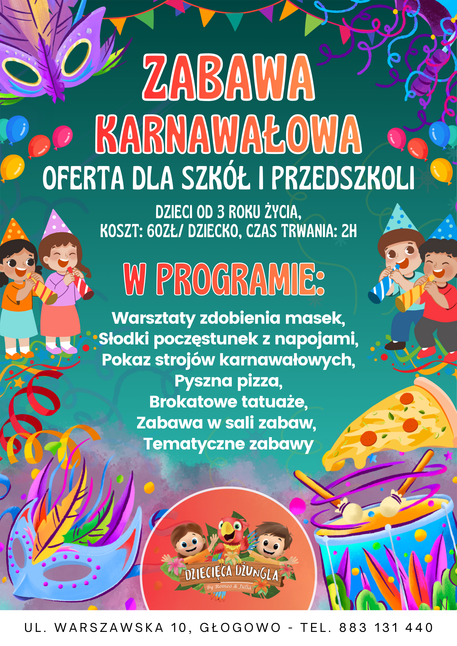 Zapraszamy szkoły i przedszkola na Zabawę Karnawałową w Dziecięcej Dżungli – pełną kolorów, animacji i dziecięcej radości. To świetna okazja do wspólnego świętowania karnawału w bezpiecznej i kreatywnej przestrzeni!